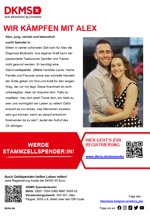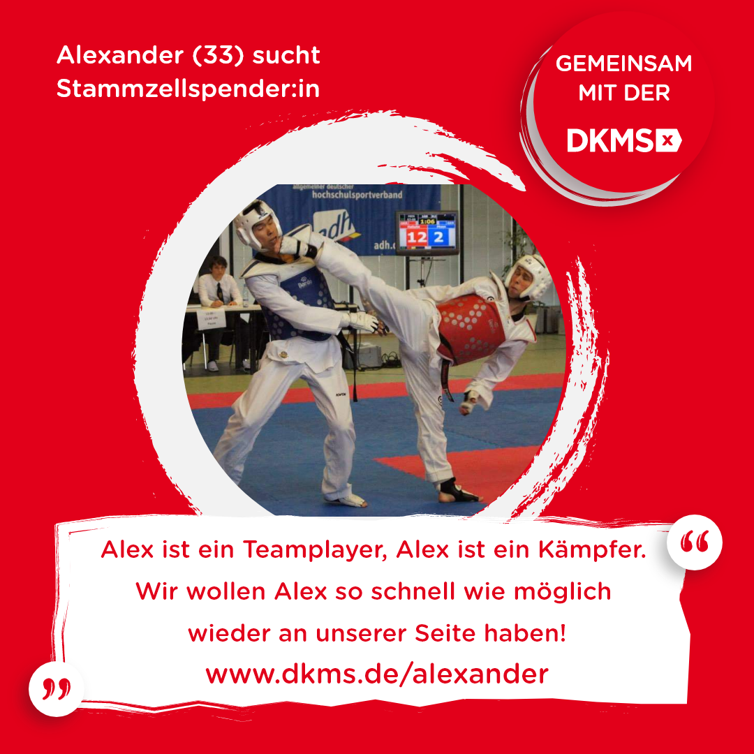 Unser Mitglied Alexander Haliulin hat vor wenigen Wochen die Diagnose Blutkrebs erhalten. Alex ist bei uns schon seit 20 Jahren Mitglied. Hier hat er vor allem durch seine erfolgreichen Kämpfe in der Taekwondo-Sparte wiederholt die Leistungsnadel Gold verliehen bekommen und war als Übungsleiter aktiv.